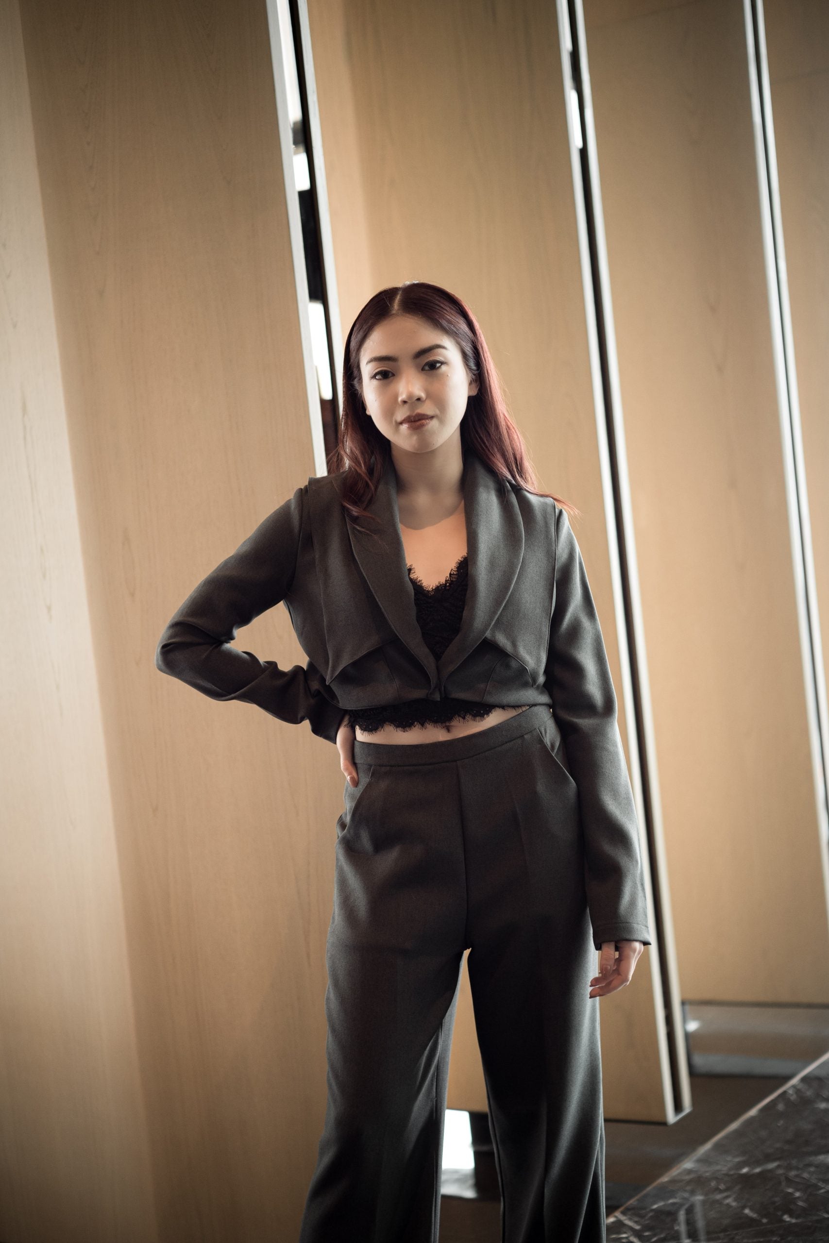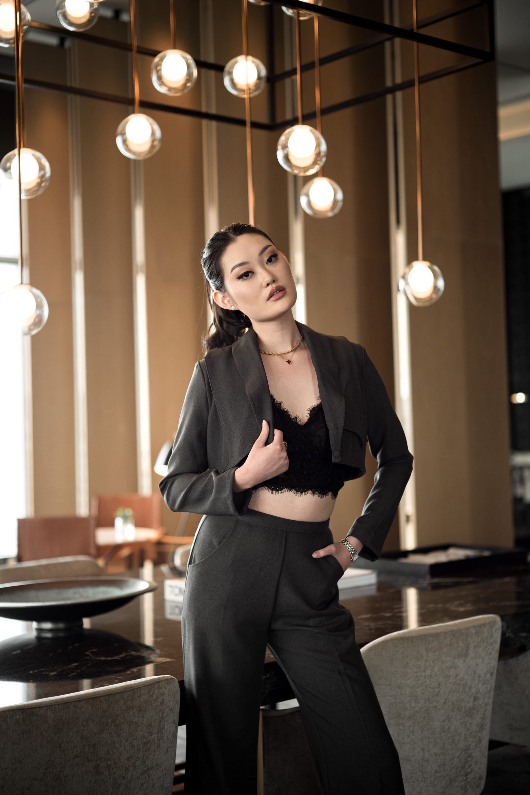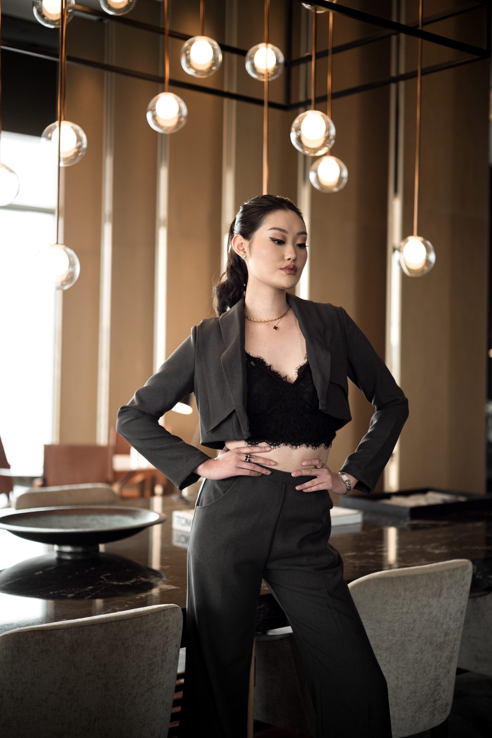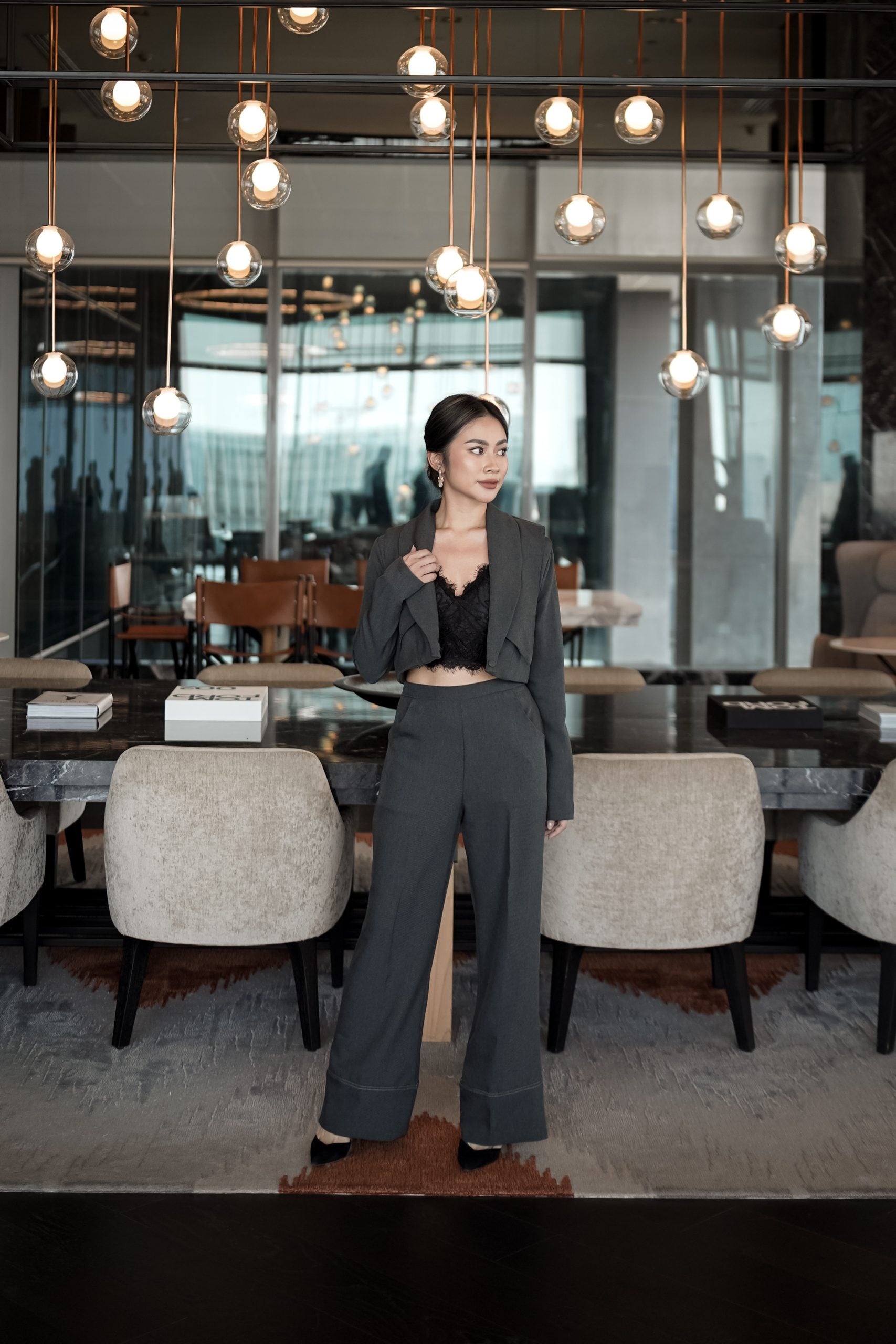 This long-sleeve crop blazer comes with a black inner bralette and features a unique sailor-style collar at the back. The front is detailed with functional buttons, adding an extra element of style. The pants in this set come with side pockets and cuff hem details (with a zipper at the back). Available in sizes S to XL.