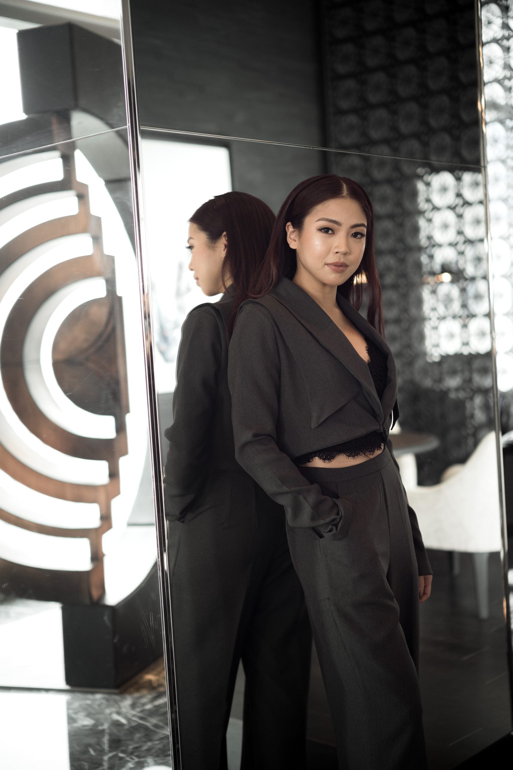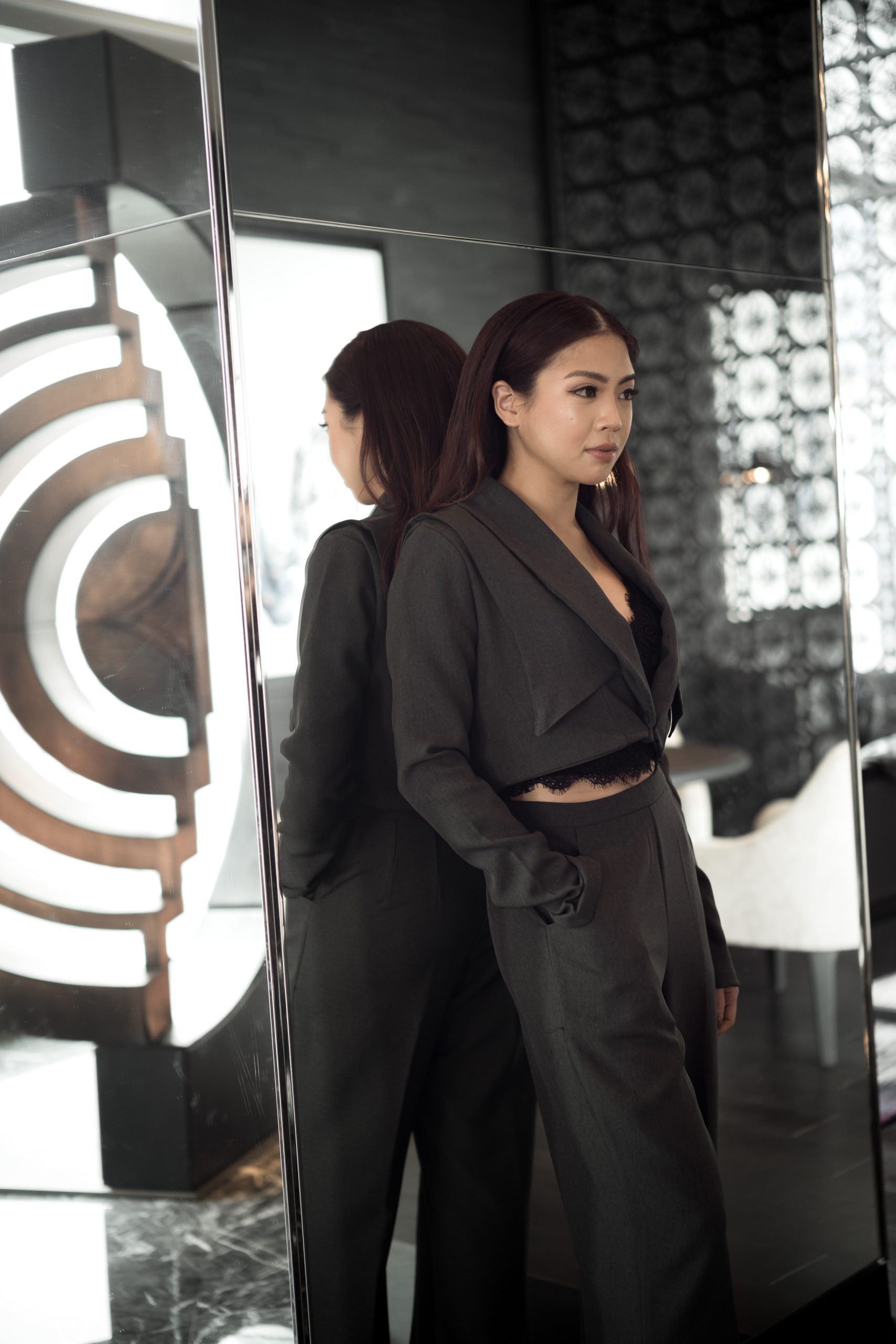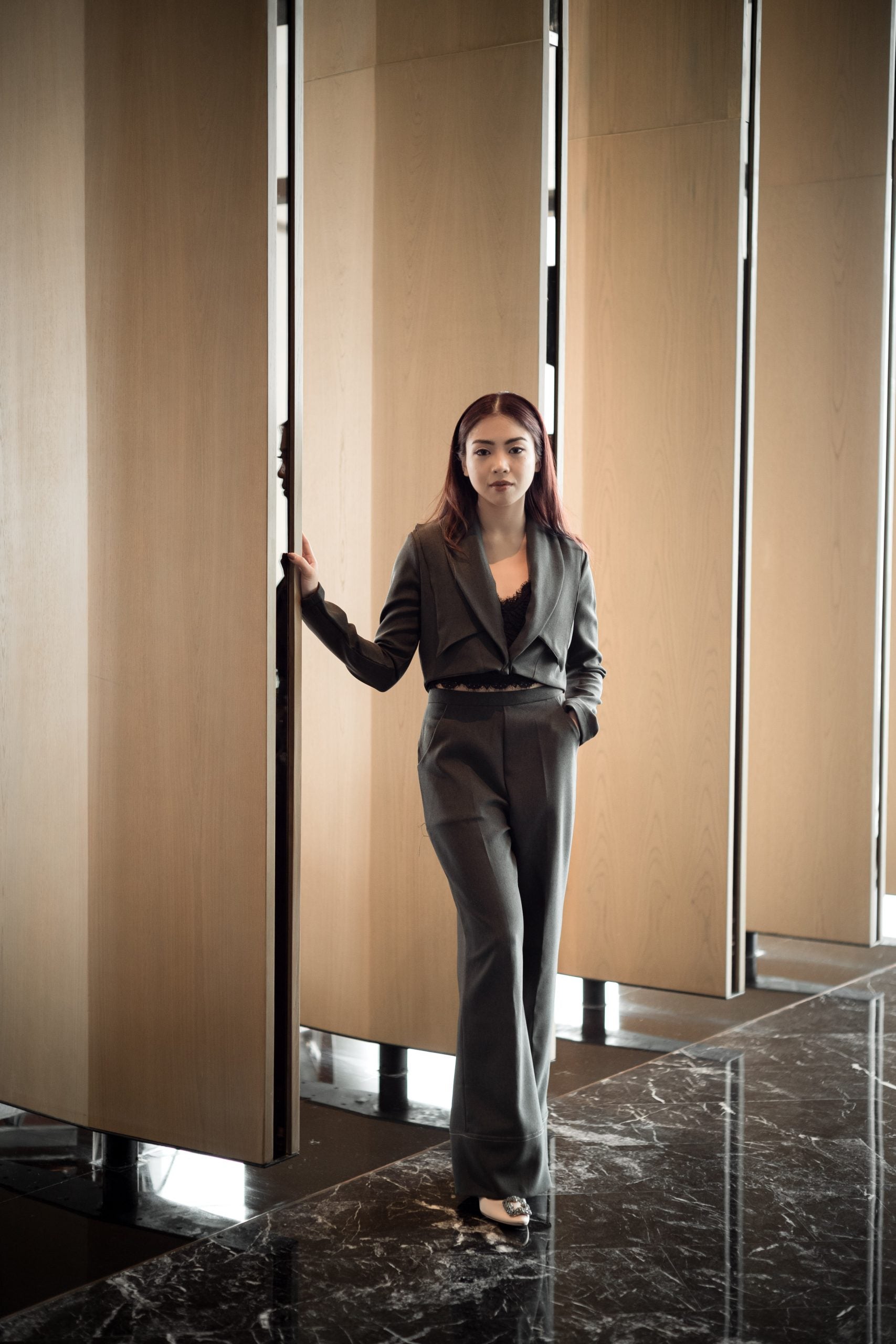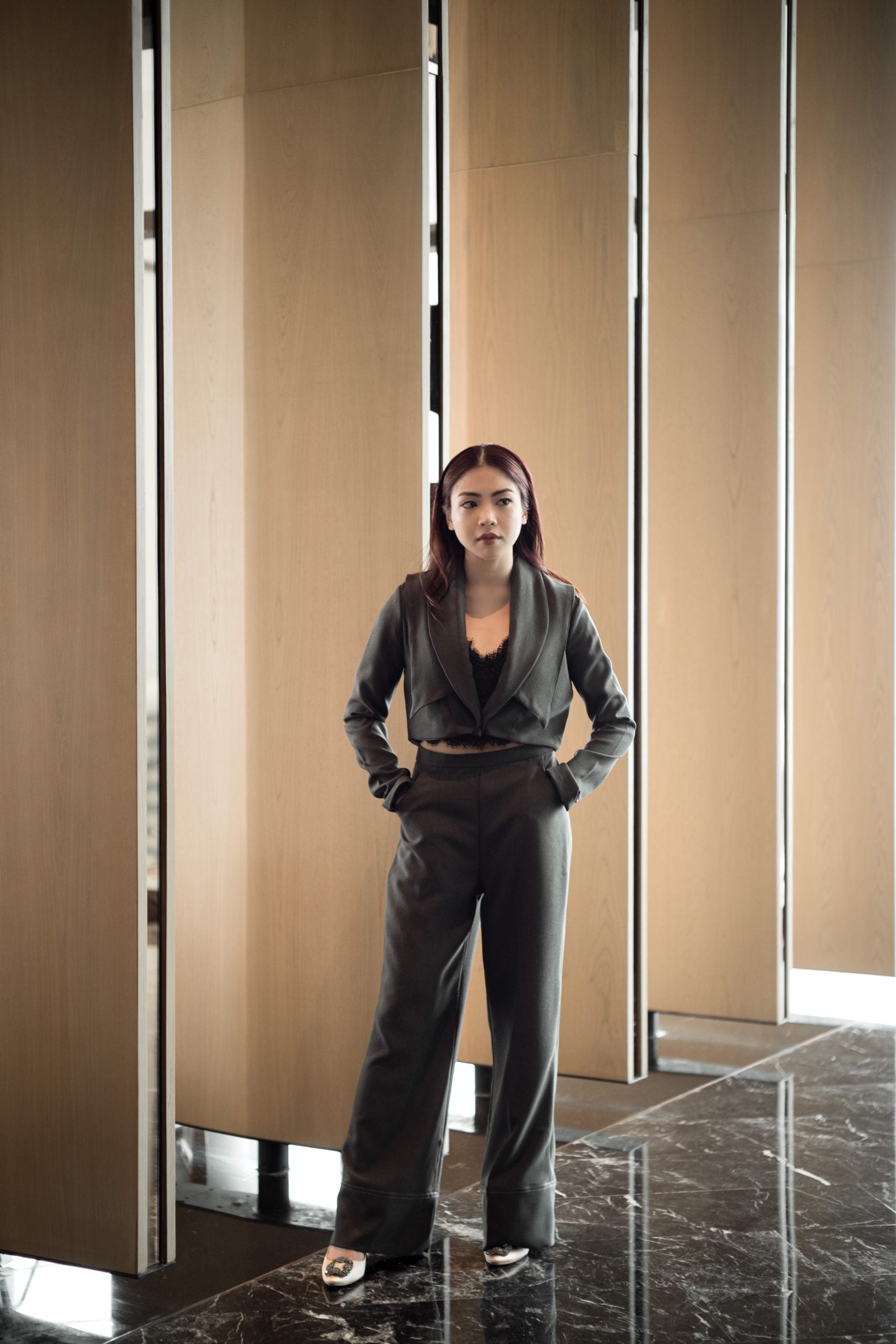 This long-sleeve crop blazer comes with a black inner bralette and features a unique sailor-style collar at the back. The front is detailed with functional buttons, adding an extra element of style. The pants in this set come with side pockets and cuff hem details (with a zipper at the back). Available in sizes S to XL.
